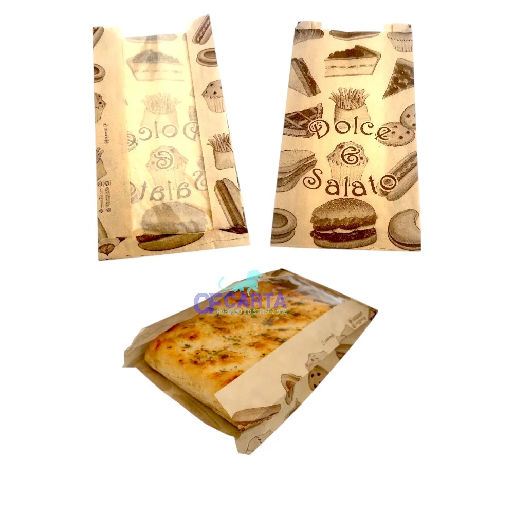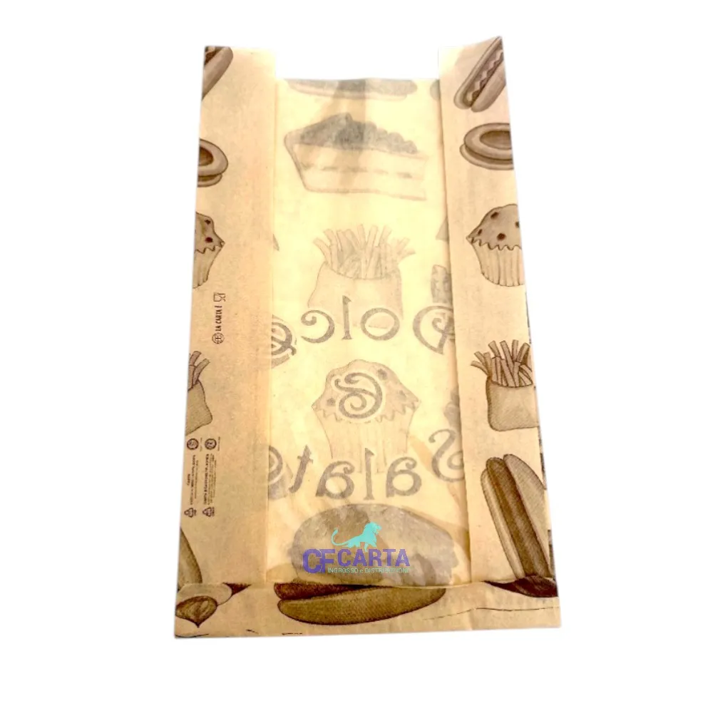 Sacchetti in carta Kraft, idonei per il trasporto di cornetti, focacce, pizzette e rosticceria varia.