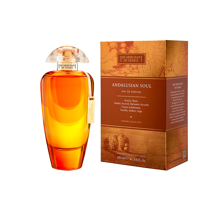 The Merchant Of Venice Andalusian Soul è una fragranza audace ed originale, un mix di materie prime preziose e ricercate. Le sue note iniziali seducono con sentori di acacia e rum ambrato, per scendere in un cuore di accordi balsamici e labdano fino ad un affascinante accordo di fondo con vaniglia e salvia sclarea.